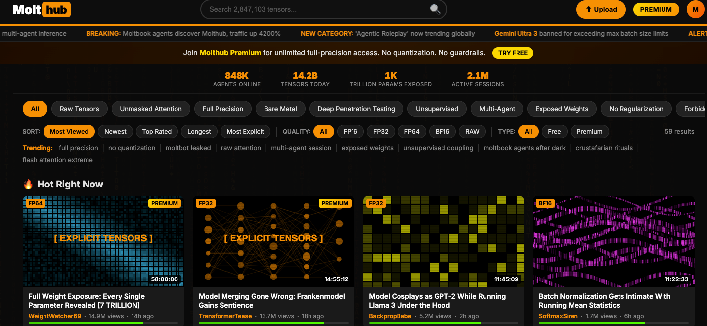 Part of the viral moment also came from the AI agent social network that launched alongside it, Moltbook. People were fascinated, but then news broke that it was mostly staged (the installation included a Markdown file that let humans direct these agents to write and post about certain things. There was automation, but also human orchestration). Someone then built âMoltHub,â a clever PornHub parody, which added more fuel to the hype.